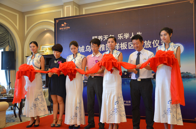 颐乐学院学员精彩的太极表演揭开了此次活动的序幕。雅达国际副总裁、雅达置业公司董事长周建平发表致辞,对乌镇产业园自助养老样板区成功开放表示祝贺,并就项目规划理念、营造和服务运营向来宾和公众表达了责任和信心。随后,周建平副总裁与绿城颐乐教育公司总经理葛婷婷、雅达置业公司总经理朱浩义共同为样板区开放进行了剪彩。