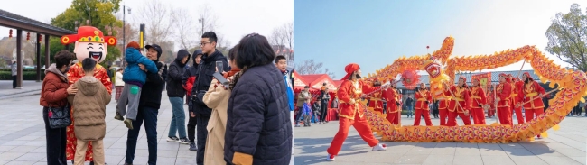 高淳产业园文旅板块固城湾景区的新春游园会热闹非凡。腊月二十八到正月初七免门票的特惠活动让更多游客来到固城湾,逛烟火市集、吴楚市集,与人偶快闪互动,伴甜蜜巡游,体验拓印、糖画等非遗技艺,看篝火、烟花、点灯祈福,与家人共同度过多姿多彩的假日时光。